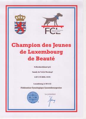 SAANDY du Val du MORAKOPF née le 12 Novembre 2021 Cotation : mère : NATI vom BARONENSCHLOSS : HD : A - ED : 0 père : NATHOS RED MILL du Domaine d'ARKA : HD : A - ED : 0 Championne des Jeunes de Luxembourg 2022 Championne du LUXEMBOURG de Beauté 2023 |