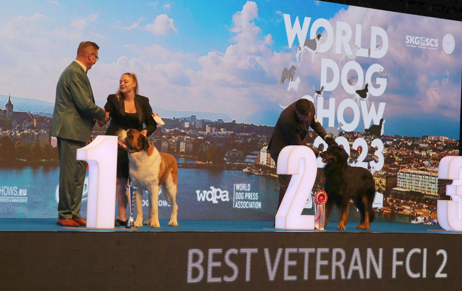 Amsterdam 2018 - Genève 2023) Je revois de vieux potes pas croisés depuis les années "COVID" ainsi que des habitués des grandes manifestations. Tout avait bien commencé, de beaux vainqueurs de classes et de CHAMPIONS du Monde... surtout IVY en vétéran . Dès les premiers jugements des poils longs, les regards étonnés se croisèrent autour du ring, sans trop comprendre la logique des choses. Bref, le juge avait oublié de réviser les bases du standard FCI N° 61 pourtant actualisé récemment. C'est le jeu...... mais ça "pique" un peu. Ce n'était pas la première fois, et ce ne sera pas la dernière. Après les jugements , direction le ring d'honneur pour la grande parade des vainqueurs. Grandiose cérémonie règlée comme une horloge "Suisse" . Immense ring, musique, moquette et paillettes, on se croyait à un Championnat du Monde...... La Grande Classe à la hauteur des tarifs pratiqués ( 120 FS/chien . Parking 20 à 40 FS selon format du véhicule) |