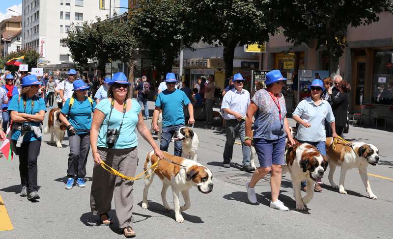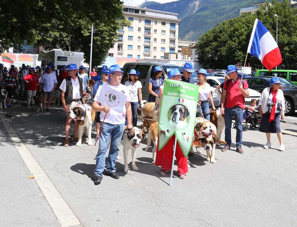 Le vendredi après midi dans les rues de Martigny, il était difficile de ne pas croiser un SAINT BERNARD.... il y en avait partout.... et le plus gros contingent était venu de FRANCE . Reconnaissables à leurs petits chapeaux bleus, la vague bleu - blanc - rouge était particulièrement visible. Belle initiative du Club Français (dress code) |